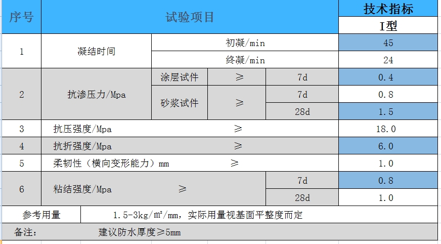 該產(chǎn)品技術(shù)指標(biāo)執(zhí)行國家行業(yè)標(biāo)準(zhǔn):聚合物水泥防水砂漿GC/T984-2011。